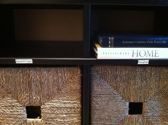 So I put it away and just thought they just enjoyed making a few labels and then I find today that she actually put it to good use. I have at the bottom of my stairs a console table with 4 openings with these baskets and each one of us has a basket for our things to go into it and then haul upstairs each night after the day is done.